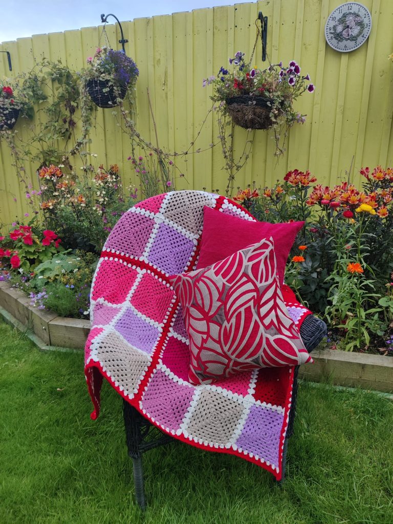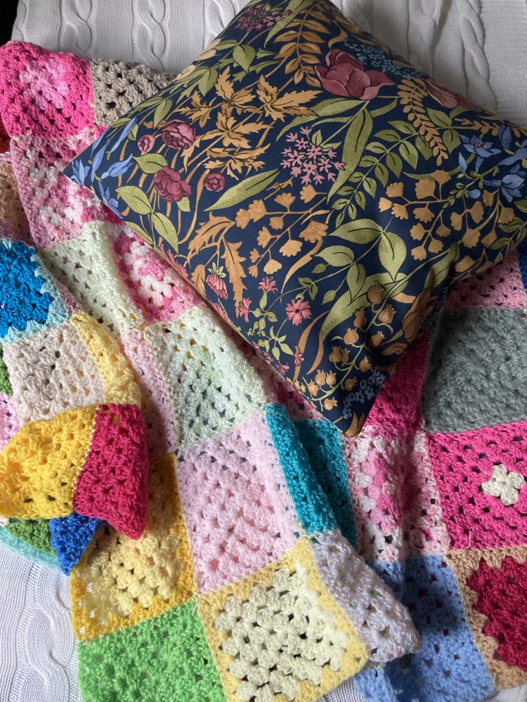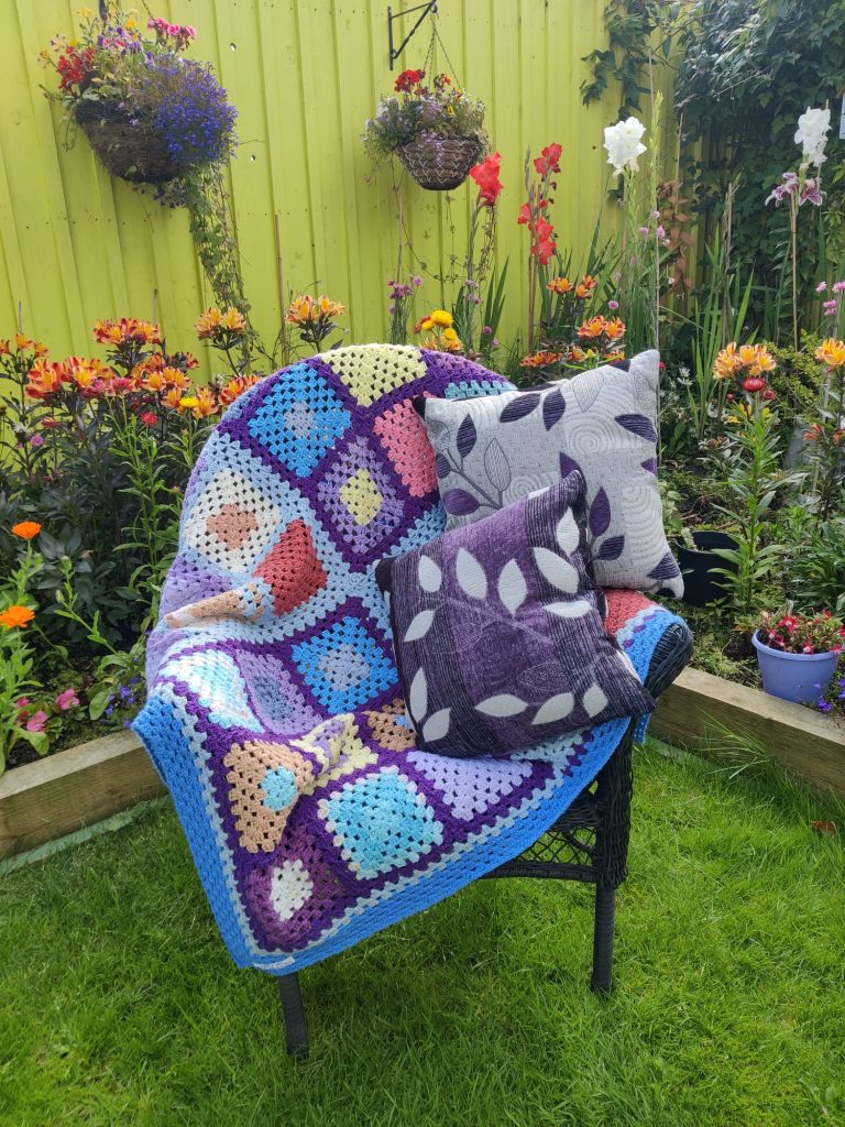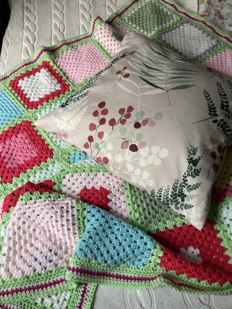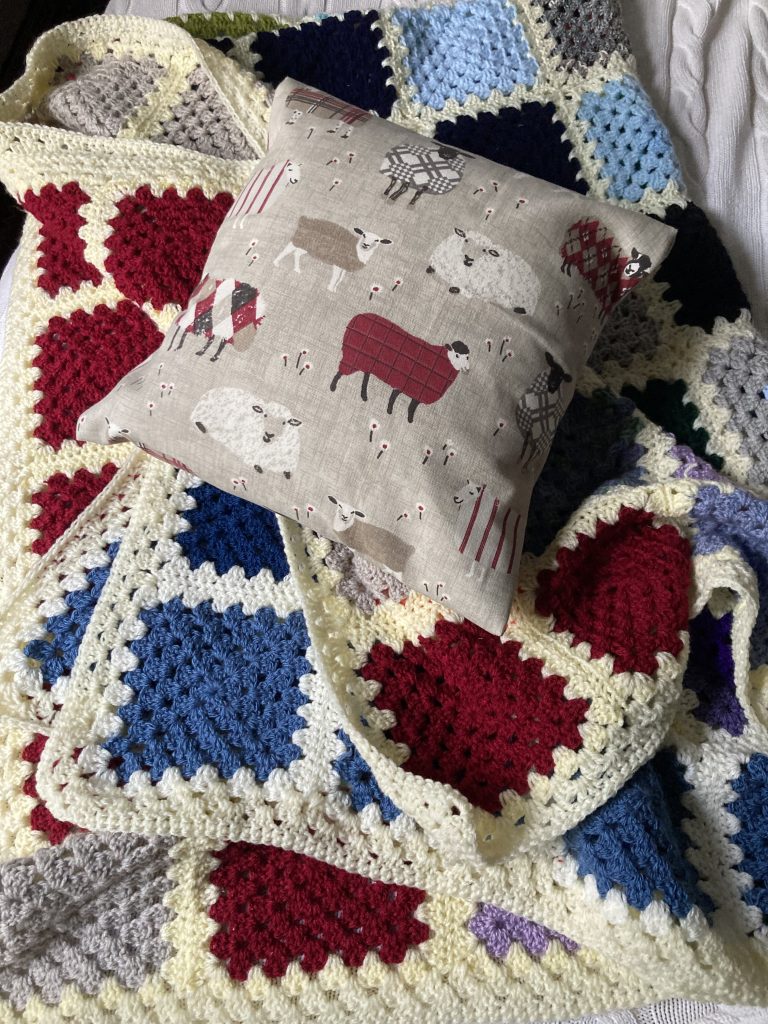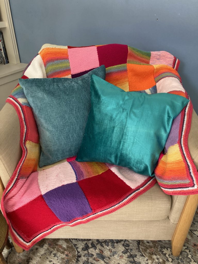 Ever wondered what all the squares look like when they are joined up ? We have lots of wonderful donations of knitted and crochet squares that we either sew or crochet together, some blankets come already joined which is great and others we have the fun of making up ourselves . Sometimes we include a cushion with the blanket which we are able to make from fabrics kindly donated by “Mad about Fabrics ” .I think you will agree they all look stunning and will add a bit of colour and warmth to the lucky recipient.