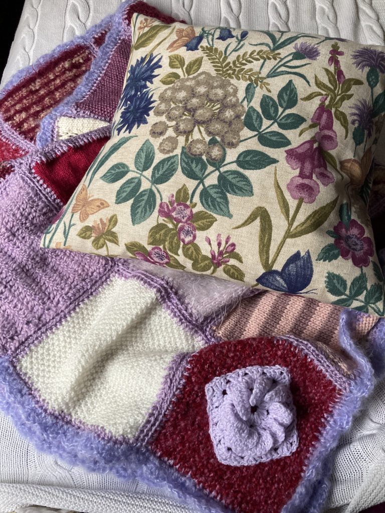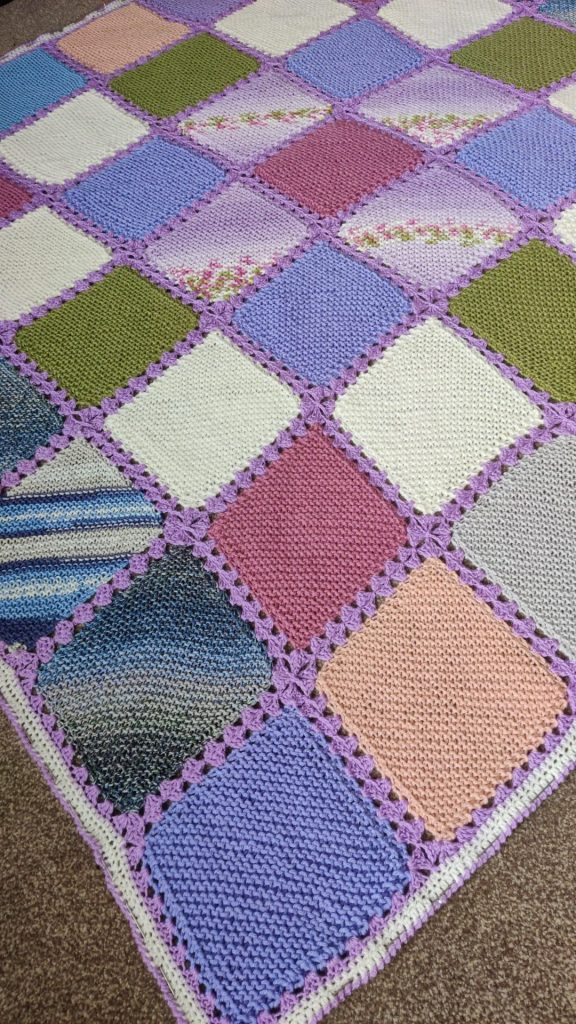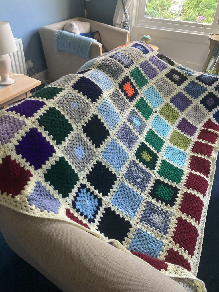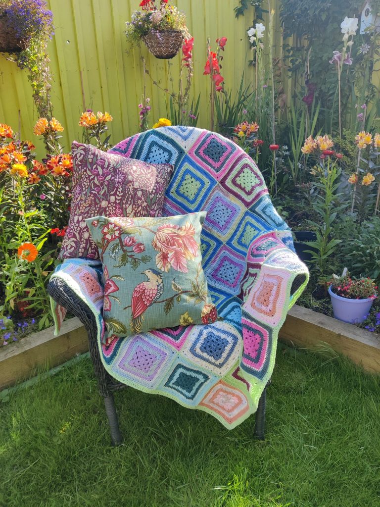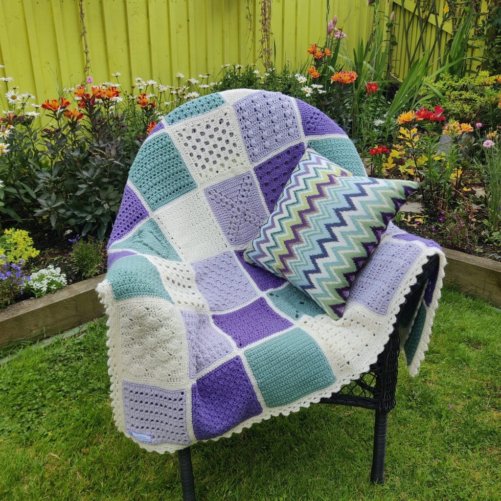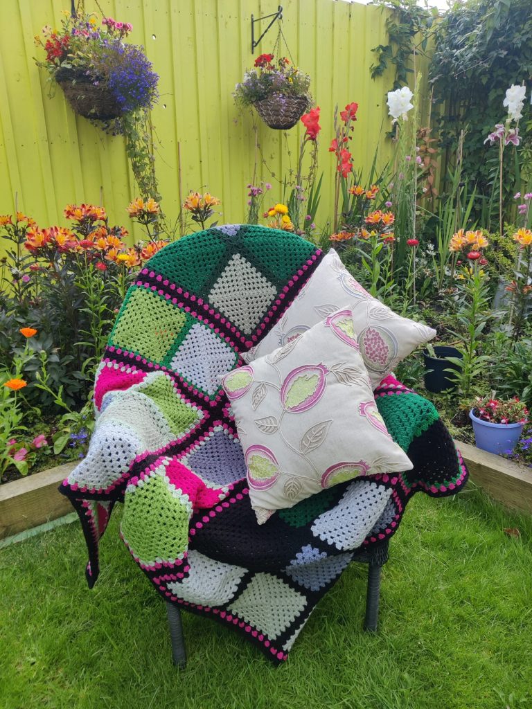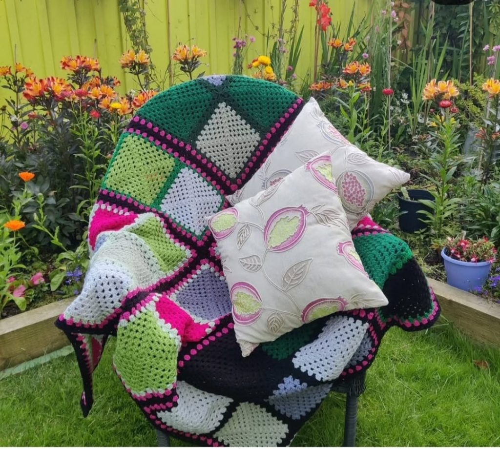 Ever wondered what all the squares look like when they are joined up ? We have lots of wonderful donations of knitted and crochet squares that we either sew or crochet together, some blankets come already joined which is great and others we have the fun of making up ourselves . Sometimes we include a cushion with the blanket which we are able to make from fabrics kindly donated by “Mad about Fabrics ” .I think you will agree they all look stunning and will add a bit of colour and warmth to the lucky recipient.
