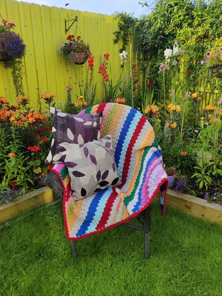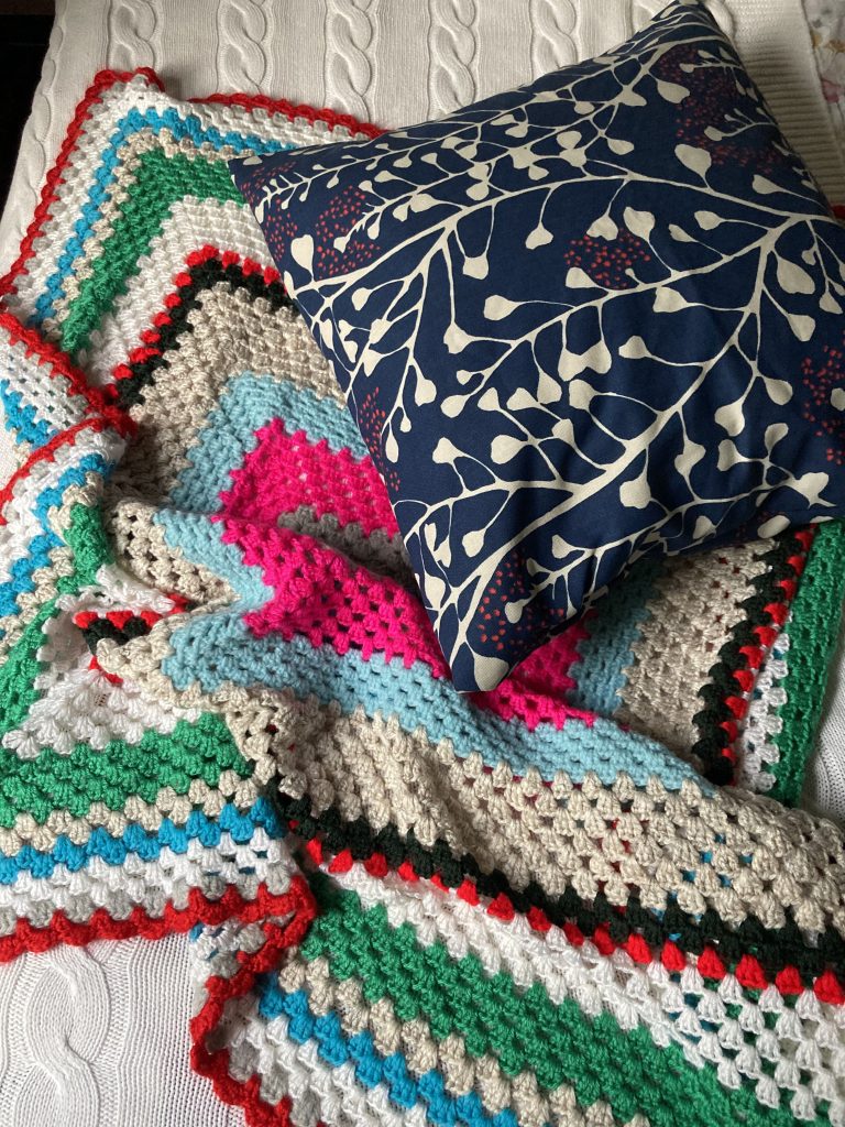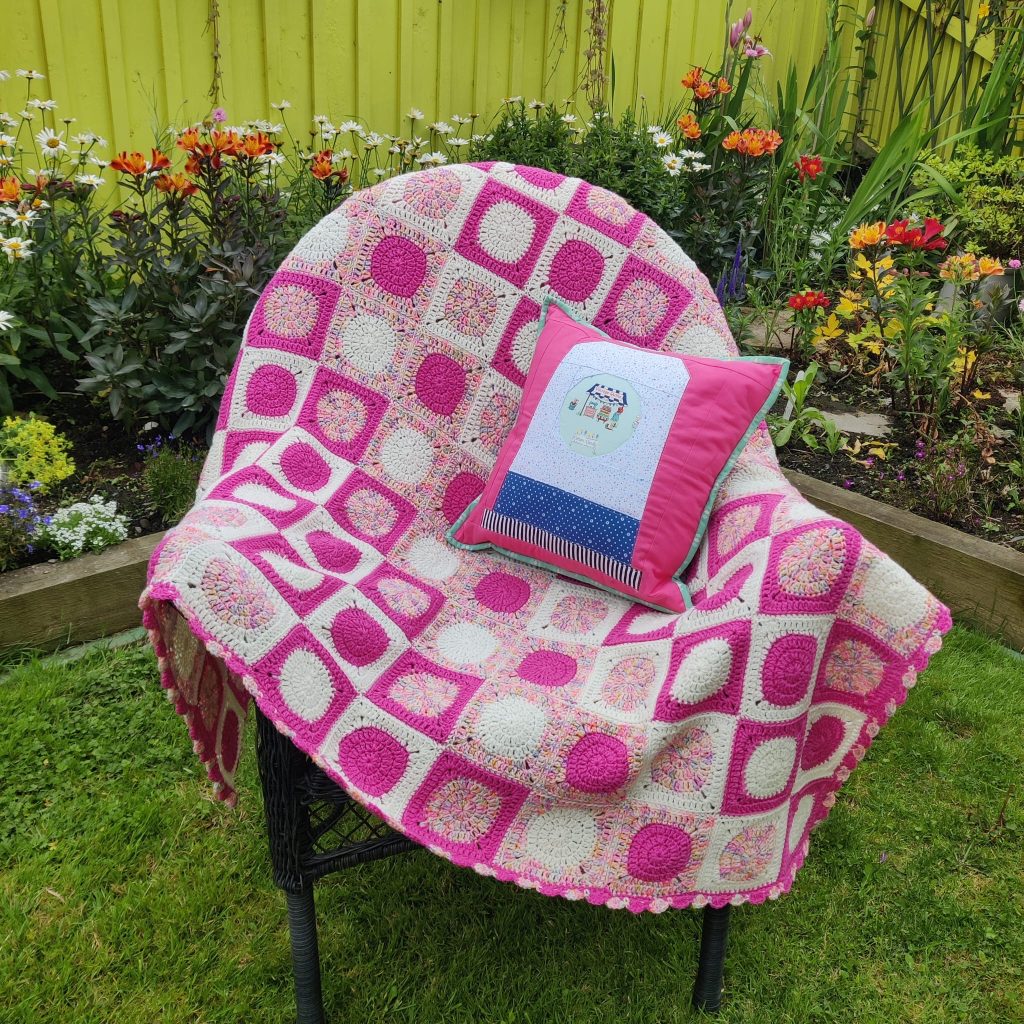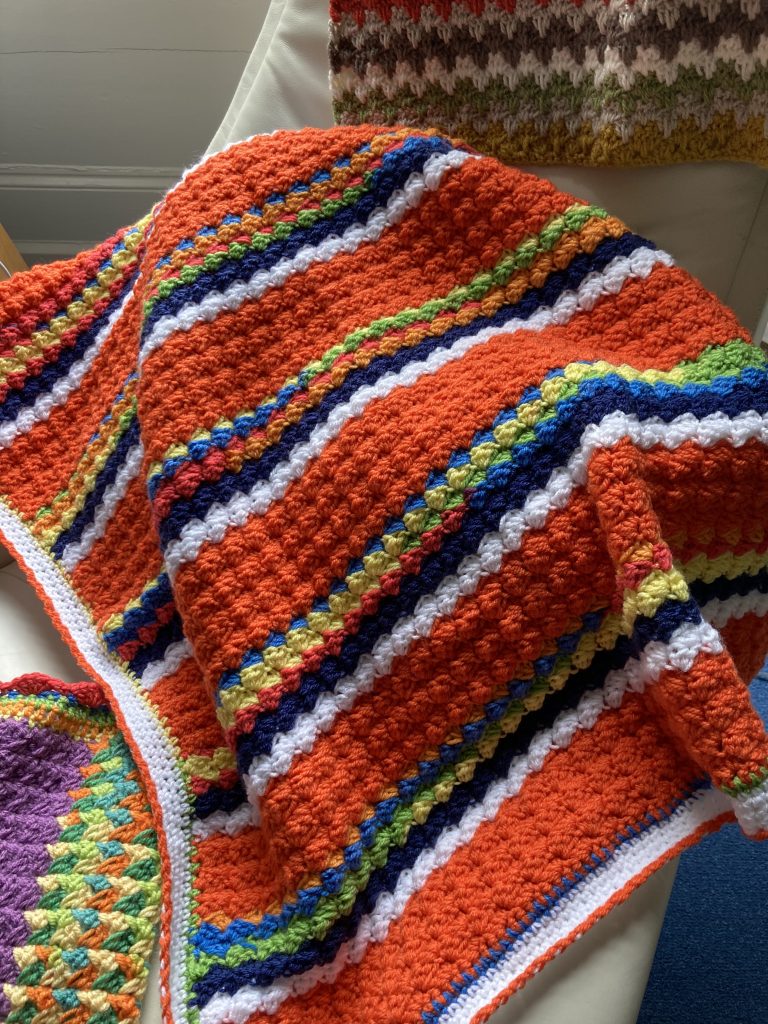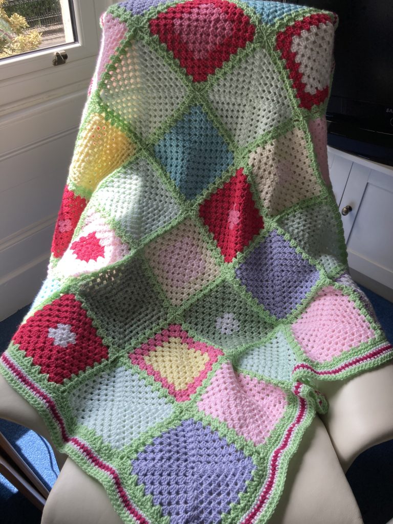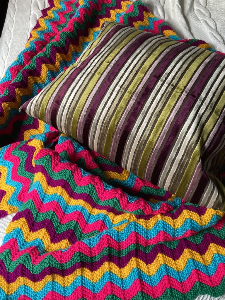 Ever wondered what all the squares look like when they are joined up ? We have lots of wonderful donations of knitted and crochet squares that we either sew or crochet together, some blankets come already joined which is great and others we have the fun of making up ourselves . Sometimes we include a cushion with the blanket which we are able to make from fabrics kindly donated by “Mad about Fabrics ” .I think you will agree they all look stunning and will add a bit of colour and warmth to the lucky recipient.