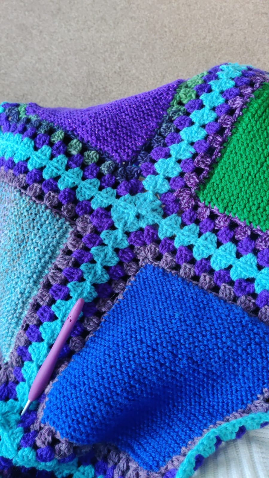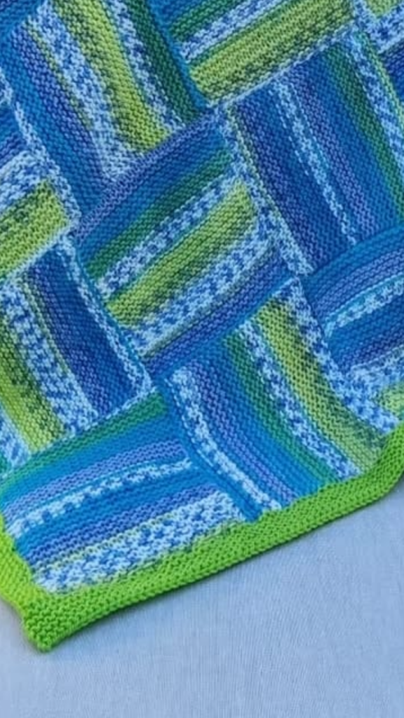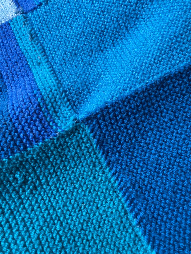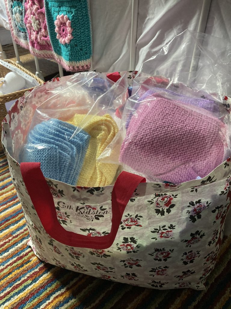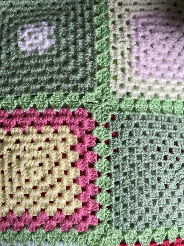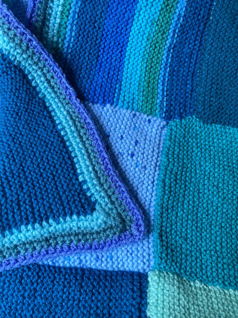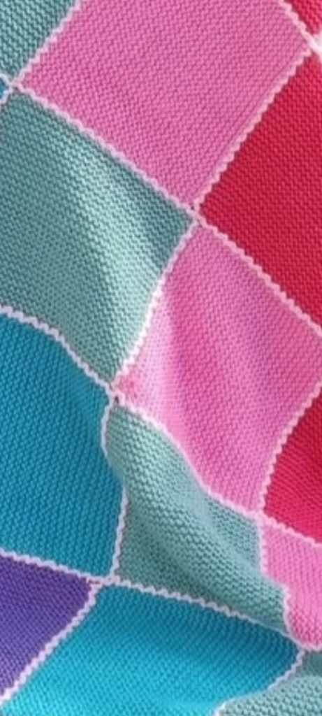 The knitted squares we usually sew together in matching yarns and we always add a border .The border can be Knitted using long circular needles or a simpler method is using good old double crochet . My problem is I don’t know when to stop adding another row!I think you will agree however that whatever method is used the finished blankets are fabulous.